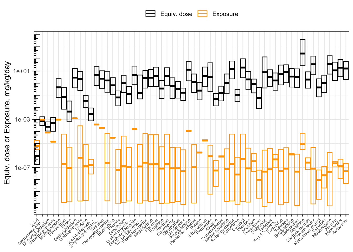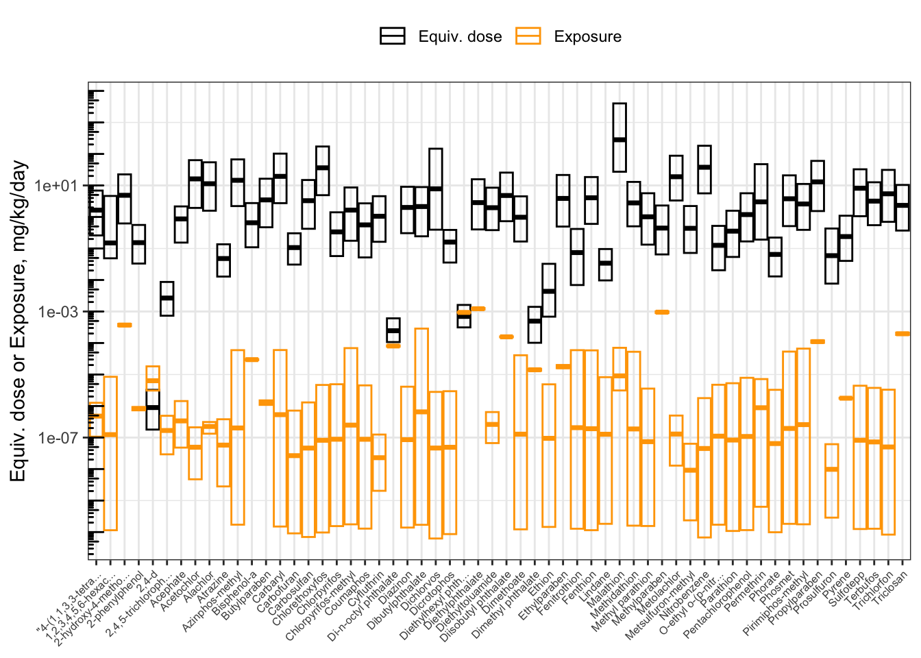 Now, the chemicals are displayed in order of increasing BER. From left to right, you can visually see the distance increase between the lower bound of equivalent doses (the bottom of the black boxes) and the upper bound of exposure estimates (the top of the orange boxes). Since the y-axis is put on a log10 scale, the distance between the boxes corresponds to the BER. We can gather a lot of information from this plot!